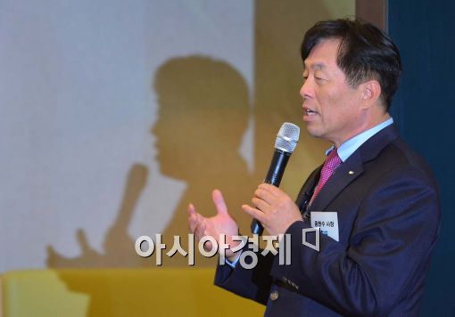 [아시아경제 백소아 기자] 동현수 두산 사장이 12일 서울 중구 두산타워에서 열린 기자간담회에서 인사말을 하고 있다.
