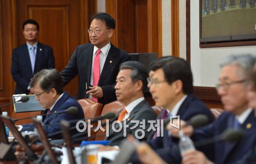 [아시아경제 백소아 기자] 13일 서울 세종로 정부서울청사에서 열린 국무회의에서 유일호 국토교통부 장관이 회의가 시작된 후 회의장에 들어와 자리에 앉고 있다.