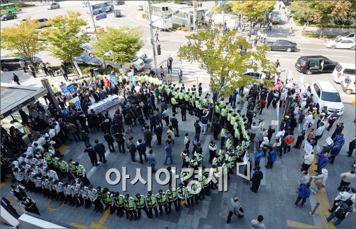 [아시아경제 윤동주 기자] 새정치민주연합이 13일 서울 여의도역 앞에서 친일·독재교과서 국정화 반대 서명운동을 벌이는 동안 어버이연합 등 보수단체 회원들이 맞은 편에서 항의 집회를 벌이자 경찰 병력이 서명운동 벌이는 장소를 막고 있다.