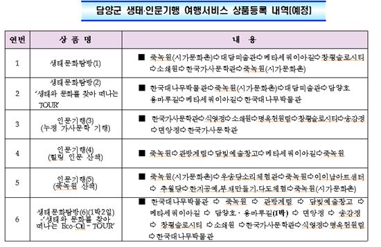 생태·인문기행은 국가기관(조달청)과 지자체(담양군)의 합작으로 개발한 지역 여행상품으로 죽녹원, 메타세쿼이아길, 소쇄원, 창평 슬로시티 등지를 돌아보는 6개 코스로 구성된다.