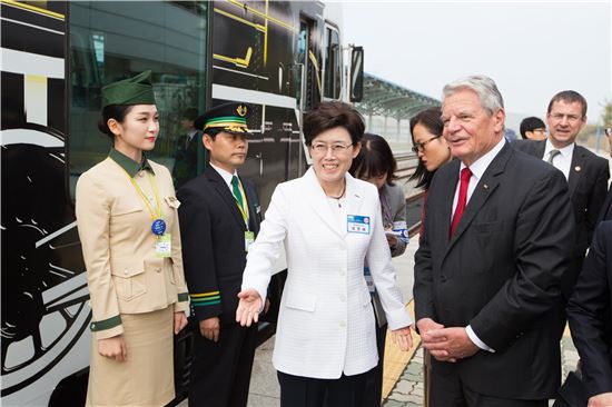 $pos="C";$title="통일의 희망 메시지를 전하는 철도 테마공간 ‘통일 플랫폼’이 14일 오전 경기도 파주시 도라산역에서 개장돼 일반에 공개됐다. 행사에 참석한 최연혜 코레일 사장(왼쪽 두 번째)이 요아힘 가우크(왼쪽 세 번째) 독일 대통령에게 플랫폼에 전시된 전시물을 소개하고 있다";$txt="통일의 희망 메시지를 전하는 철도 테마공간 ‘통일 플랫폼’이 14일 오전 경기도 파주시 도라산역에서 개장돼 일반에 공개됐다. 행사에 참석한 최연혜 코레일 사장(왼쪽 두 번째)이 요아힘 가우크(왼쪽 세 번째) 독일 대통령에게 플랫폼에 전시된 전시물을 소개하고 있다";$size="550,366,0";$no="2015101416303645294_2.jpg";@include $libDir . "/image_check.php";?>