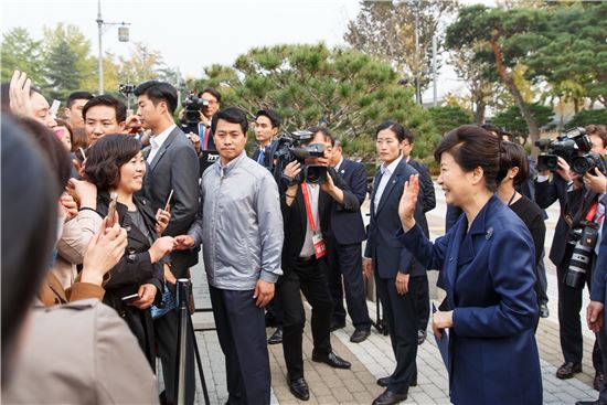 박 대통령이 이날 청와대 사랑채에서 진행된 한복 전시회를 관람한 뒤 행사장을 나오자 청와대 분수대 주변에 있던 관광객들이 몰려와 사진을 찍으며 환호했다.