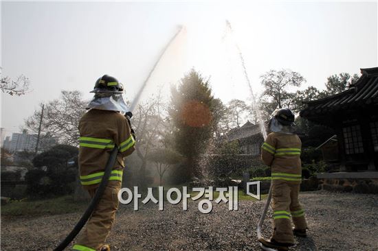 광주 북구(청장 송광운)와 북부소방서(서장 조태길)는 21일 매곡동 김용학가옥에서 문화재 화재대응 훈련을 실시하고 소방서 대원들이 장비를 이용해 가상 화재 진압 훈련을 하고 있다.
