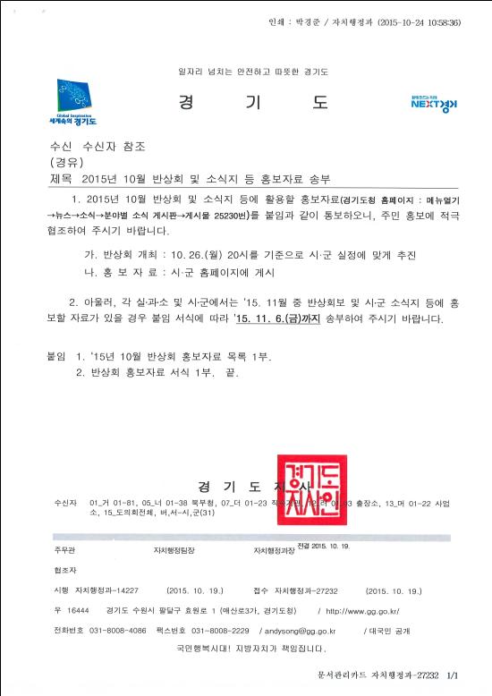 경기도는 행자부로부터 공문을 수령한 뒤 곧바로 자치행정과장 명의로 "10월 반상회 및 소식지 등에 활용할 홍보자료를 붙임과 같이 통보하오니, 주민홍보에 적극 협조하여 주기시 바랍니다"라는 내용의 공문을 도내 31개 시·군에 전달했다.