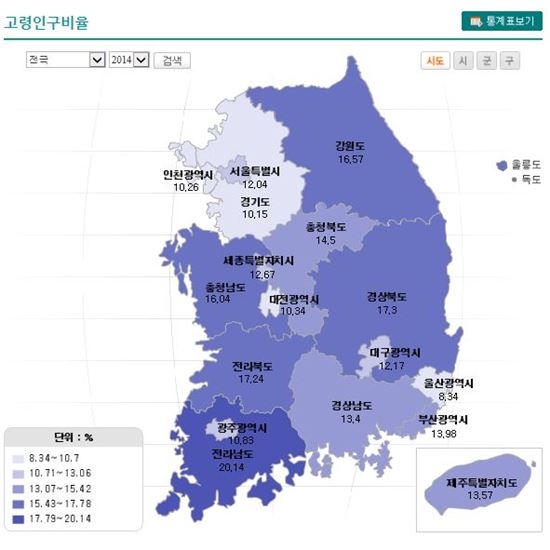 가령 지난해 기준 고령화비율이 전국 평균보다 낮았던 지역은 울산시, 인천시, 대전시, 경기도, 광주시, 서울시, 대구시, 세종시 등(1위~8위)으로 경기도를 제외한 대부분 지역이 광역도시인 것으로 조사된다.