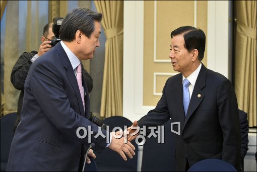 [아시아경제 윤동주 기자] 김무성 새누리당 대표가 27 국회에서 열린 현역병 입영적체 해소를 위한 당정협의에 참석, 한민구 국방부 장관과 인사를 나누고 있다.