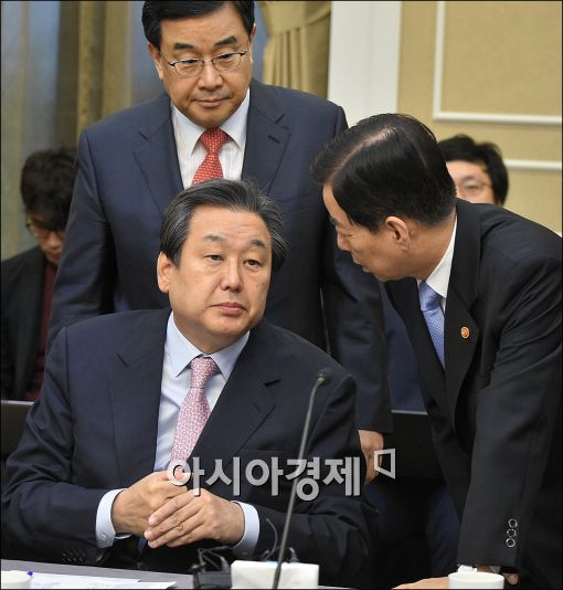 [아시아경제 윤동주 기자] 김무성 새누리당 대표가 27 국회에서 열린 현역병 입영적체 해소를 위한 당정협의에 참석, 한민구 국방부 장관과 이야기를 나누고 있다.