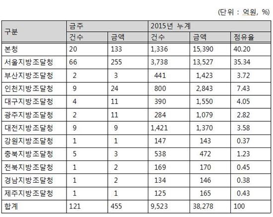지역별 발주량은 대전본청 133억원, 서울지방청 255억원 등 2개청이 전체 금액의 85.2%를 차지하고 이외에 10개 지방청에선 총 67억원이 집행될 예정이다.