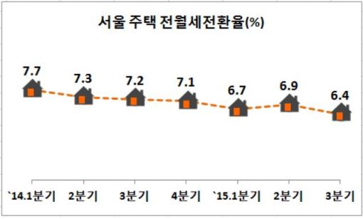 29일 서울시가 서울부동산정보광장(http://land.seoul.go.kr)에 공개한 자료에 따르면 올 3분기 서울시내 반전세(보증부 월세) 주택의 전월세전환율은 연 6.4%로 지난해 같은 기간보다 0.8%포인트 하락했다.