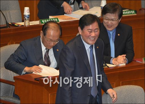 [아시아경제 윤동주 기자] 최경환 경제부총리 겸 기획재정부 장관이 30일 국회에서 열린 예결위 전체회의에 출석, 황우여 교육부 장관과 이야기를 나누다 활짝 웃고 있다.