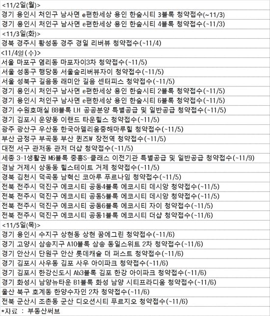 1일 부동산정보업체 부동산써브(serve.co.kr)에 따르면 이번 주에는 청약접수 28곳, 당첨자 발표 32곳, 당첨자 계약 20곳 등이 예정돼 있다.