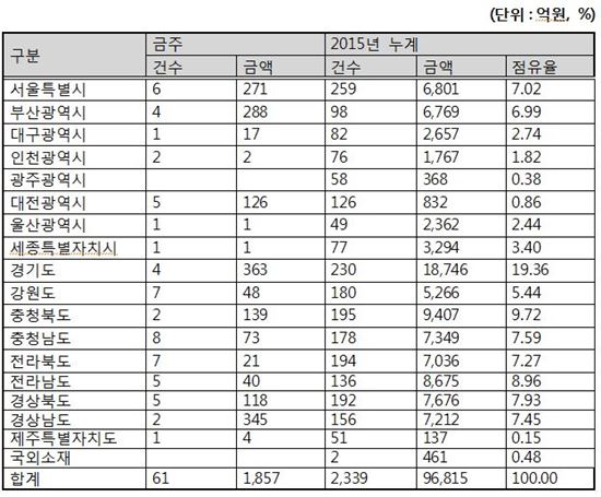 지역별로는 경기도 363억원, 경남345억원, 부산 288억원, 서울시 271억원, 충북 139억원과 이외에 지역 451억원 등의 입찰이 진행된다.