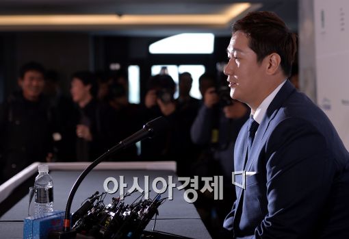 [아시아경제 김현민 기자] 일본프로야구 소프트뱅크 이대호가 3일 서울 중구 반얀트리호텔에서 향후 거취 기자회견을 열고 미국 메이저리그 진출을 선언하고 있다.