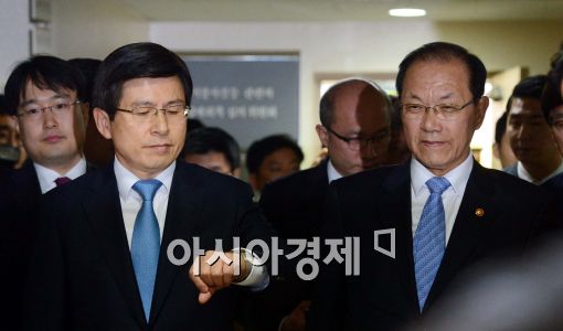[아시아경제 최우창 기자] 황교안 국무총리가 3일 오전 정부 서울청사에서 한국사교과서 국정화 확정고시를 하고 역사교육 정상화를 주제로 <국민께 드리는 말씀> 대국민담화를 발표하기 전 잠시 시계를 보고 있다.