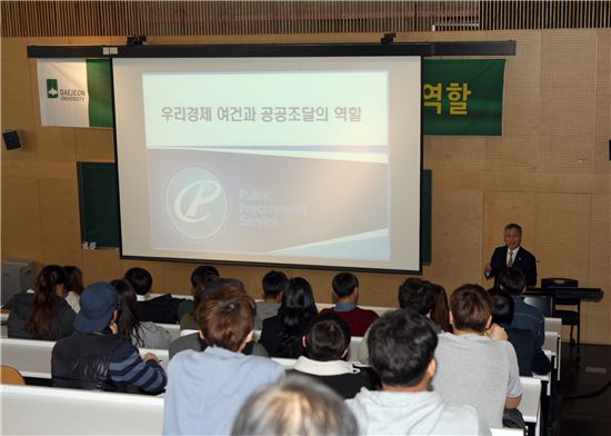 [아시아경제(대전) 정일웅 기자] 김상규 조달청장은 5일 대전대 30주년 기념관에서 사회과학대 재학생 100여명을 대상으로 ‘우리 경제 여건과 공공조달의 역할’을 주제로 특강을 했다. 김 청장은 학생들에게 “국내외 경제 성장이 둔화되는 시점, 내수 진작을 통한 경기 활성화가 필요하다”며 “일자리 창출과 경제 부문의 활력 제고를 위해 창업기업의 조달시장 진입 문턱을 지속적으로 완화해 나갈 것”이라고 전했다.