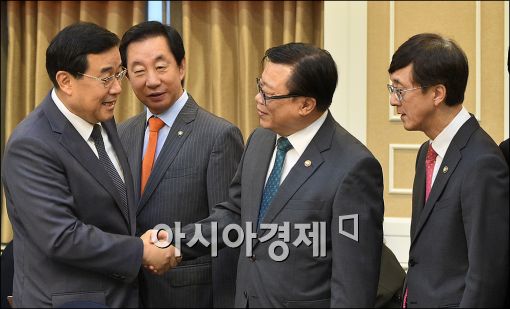 [아시아경제 윤동주 기자] 김정훈 새누리당 정책위의장이 11일 국회에서 열린 가뭄 극복 당정협의에 참석, 이동필 농림축산식품부 장관과 인사를 나누고 있다.