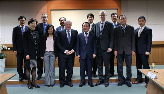 [아시아경제(대전) 정일웅 기자] 이준석 특허청 차장은 11일 본청 서울사무소 대회의실에서 국제변리사연맹 회장단과 간담회를 가졌다. 이 차장(앞줄 왼쪽 네 번째)과 디쓰 더글라스(Douglas DEETH) 국제변리사연맹 회장(앞줄 왼쪽 세 번째) 등 주요 인사들이 간담회를 마치고 기념사진을 찍고 있다. 특허청 제공