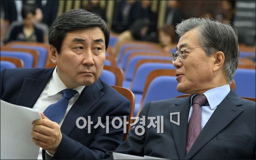 [아시아경제 윤동주 기자] 문재인 새정치민주연합 대표가 12일 국회에서 열린 정책의원총회에서 안민석 예결위 간사, 이종걸 원내대표와 이야기를 나누고 있다.