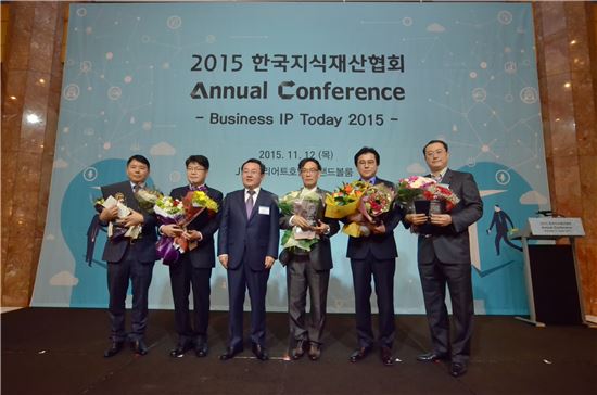 [아시아경제(대전) 정일웅 기자] 특허청은 12일 한국지식재산협회와 함께 서울 JW 메리어트 호텔(서초구 반포동)에서 ‘2015년 한국지식재산협회(KINPA) 국제컨퍼런스’를 개최했다. (왼쪽부터) 삼성정밀화학 변길석 팀장, 한화테크윈 이재성 수석, 특허청 이준석 차장, 테스 이준섭 차장, LG전자 임연래 부장, 삼성디스플레이 배종성 수석 등이 기념사진을 찍고 있다. 특허청 제공