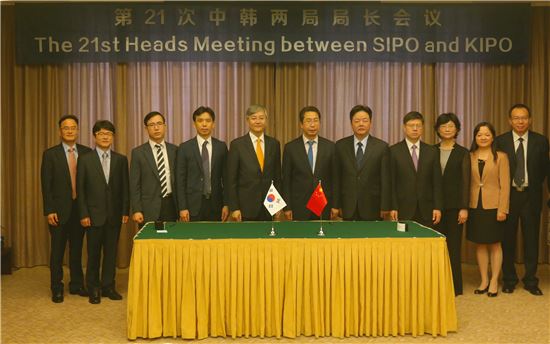 [아시아경제(대전) 정일웅 기자] 특허청은 16일(중국 현지시간) 중국 광저우 광동영빈관에서 ‘한-중’ 특허청 간 특허정보데이터 교환에 관한 양해각서를 체결하고 양국의 심판제도 개선방안에 대한 의견을 공유했다. 최동규 특허청장(왼쪽 다섯 번째)과 션창위 중국 특허청장(왼쪽 여섯 번째) 등이 기념사진을 찍고 있다. 특허청 제공