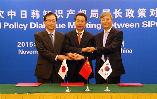 [아시아경제 정일웅 기자] 최동규 특허청은 17일(현지시간 기준) 중국 광저우 광동영빈관에서 열린 ‘제15차 한·중·일 특허청장 회담’에 참석했다. 이날 각국 특허청장은 지재권 용어사전 공동개발 및 중소기업 지원정책 공유, 정보교환 등에 합의했다. 최 청장(왼쪽 세 번째)과 션창위 중국 특허청장(왼쪽 두 번째), 이토 히토시 일본 특허청장(왼쪽 첫 번째)이 회담을 마치고 기념사진을 찍고 있다. 특허청 제공
