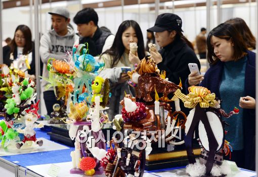 [아시아경제 최우창 기자] 18일 오전 서울 강남구 코엑스에서 개막한 푸드 위크 코리아 2015 '서울 국제 빵 과자 페스티벌'을 찾은 시민들이 설탕으로 만들어진 .