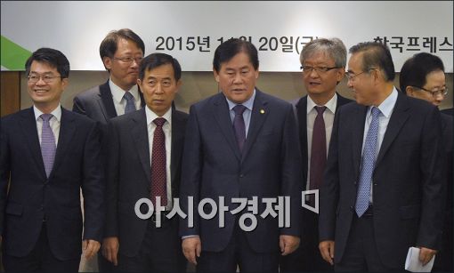[아시아경제 윤동주 기자] 최경환 경제부총리 겸 기획재정부 장관이 20일 서울 중구 프레스센터에서 열린 '연구기과장 초청 조찬간담회'에 참석, 참석자들과 포즈.