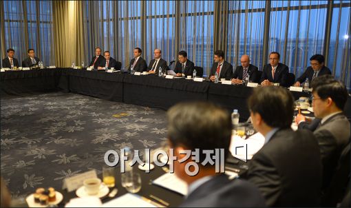 [아시아경제 윤동주 기자] 진웅섭 금감원장이 24일 서울 여의도 콘래드호텔에서 외국계 금융사 CEO들과 조찬간담회를 갖고 있다.