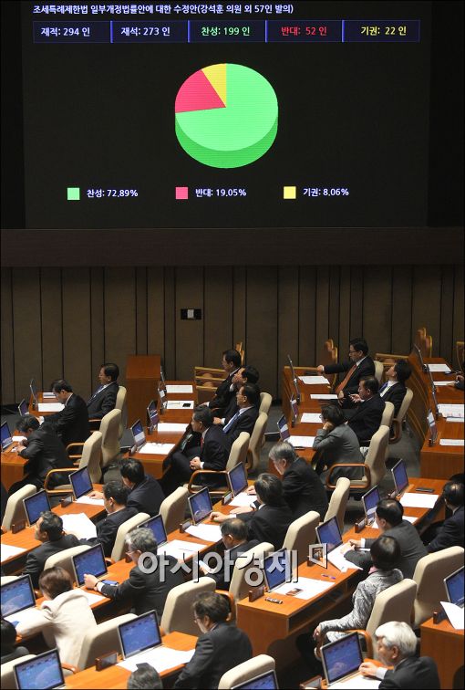 [아시아경제 윤동주 기자] 내년도 예산안 처리를 위한 마지막 날인 2일 서울 여의도 국회 본회의장에서 개인자산종합관리계좌(ISA)의 비과세 혜택이 총급여 5000만원 이하를 대상으로 현행 200만원에서 250만원으로 확대되는 내용을 담은 조세특례제한법 개정안이 본회의를 통과하고 있다.