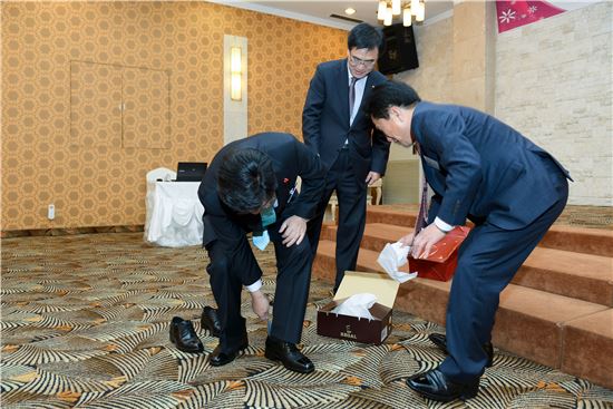 [아시아경제(대전) 정일웅 기자] 권선택 대전시장은 지난 2일 대전전력산업발전협의회 ‘송년의 밤’ 행사에서 새 구두 한 켤레를 선물 받았다. 지난해 7월 1일 취임 후 500일간 시정현안에 매진해 온 권 시장의 노고에 고마움을 표한다는 의미에서다. 임기 동안 권 시장이 현장을 누빈 거리는 3만8000여㎞로 그간의 여정에 낡아진 구두를 새 구두로 바꿔준다는 의미부여도 함께 곁들였다. 권 시장이 대전전발협 관계자들로부터 선물 받은 새 구두를 행사장에서 갈아 신고 있다. 대전시제공