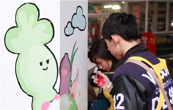 지난달 16일부터 이달 3일까지 대전오류전통시장에서 실시된 이 행사는 한밭대 시각디자인학과 2학년 학생 30여명이 참여, 시장 내 기둥과 벽에 채소·정육·분식류·세탁소 등 상점별 이미지를 캐릭터로 디자인하는 형태로 진행됐다.
