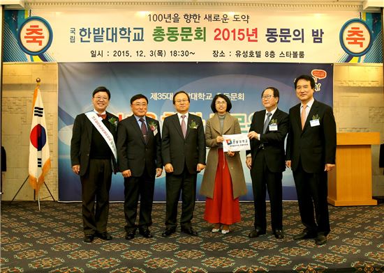 [아시아경제(대전) 정일웅 기자] 한밭대는 3일 열린 총동문회 동문의 밤 행사에서 대학 발전기금 조성을 위한 ‘한밭사랑 이음 나눔 100인의 동행’ 기부릴레이 운동을 전개했다. 이날 대학은 총 7명으로부터 2200만원의 기부약정을 받았다. 기부릴레이는 오는 2027년 ‘개교 100주년을 향한 새로운 도약’의 초석으로 마련, 대학발전 후원 특별위원회가 추진한다. 동문의 밤 행사를 마치고 민병찬 대학발전후원특별위원장, 김만구 총동문회장, 송하영 한밭대 총장, 정효선 건축공학과 동문, 김승수 승우건설㈜ 대표이사, 성열구 ㈜대청엔지니어링 대표이사 등이 기념사진을 찍고 있다. 한밭대 제공