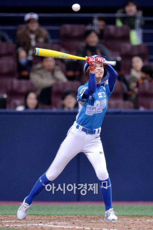 [고척=아시아경제 김현민 기자] 2015 희망더하기 자선 야구대회가 6일 고척스카이돔에서 열렸다. 종범신 팀 배지현이 8회 대타로 나서 삼진으로 물러나고 있다.