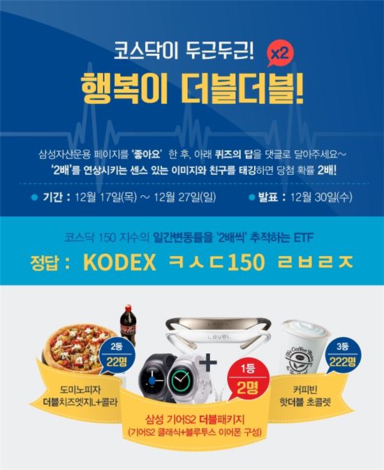 [아시아경제 이정민 기자] 삼성자산운용은 페이스북 이용자를 대상으로 ‘코스닥이 두근두근! 행복이 더블더블!’이벤트를 진행한다고 17일 밝혔다.