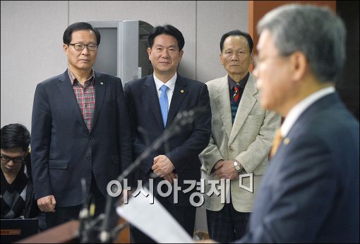 [아시아경제 윤동주 기자] 20일 서울 여의도 국회에서 열린 김동철 의원에 새정치민주연합 탈당 기자회견을 문병호 의원이 지켜보고 있다.