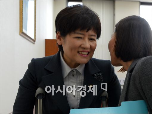[아시아경제 윤동주 기자] 강은희 여성가족부 장관 내정자가 21일 서울 여의도 국회에서 기자브리핑을 마친 후 보좌관으로부터 보고를 받고 있다.