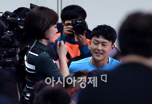 [장충=아시아경제 김현민 기자]올해로 열세 번째를 맞는 'Share The Dream Football Match 2015' 홍명보 자선축구경기가 27일 서울 중구 장충체육관에서 열렸다. 희망팀 이승우가 정지원 아나운서와 세리머니하고 있다. 이번 자선경기는 청년 실업 해소와 소아암 환우 치료비 마련을 위해 진행됐다.