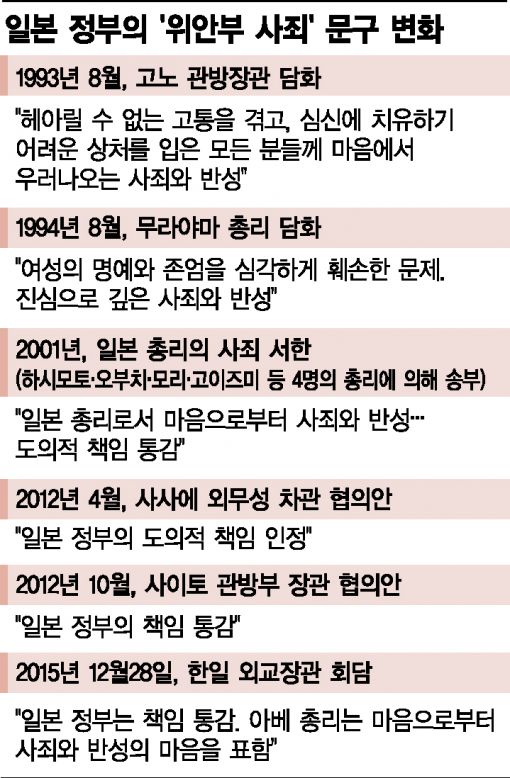 그러나 기시다 후미오 외무상은 28일 한일 외교장관회담 후 공동기자회견 발표문에서 "위안부 문제는 당시 군의 관여하에 다수 여성의 명예와 존엄에 깊은 상처를 입은 문제로, 이런 관점에서 일본 정부는 책임을 통감한다"고 밝혔다. 아베 신조 일본 총리는 협상 타결 직후 박근혜 대통령과의 통화에서도 "일본국 내각 총리대신으로서 많은 고통을 겪고 심신에 걸쳐 치유하기 어려운 상처를 입은 모든 분들에 대한 마음으로부터 사죄와 반성의 마음을 표명한다"고 전했다.