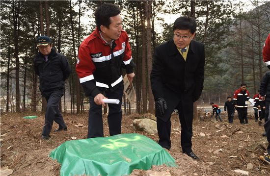 [아시아경제(대전) 정일웅 기자] 신원섭 산림청장은 새해 첫 현장 점검으로 6일 안성·광주·남양주·양평·원주 등 경기와 강원지역의 재선충병 피해지를 시찰, 방제현황을 보고받았다. 산림청은 재선충병 완전 방제 계획에 따라 오는 2017년까지 피해본수를 관리 가능한 수준으로 낮추기 위해 방제를 실시하는 중이다. 신 청장(왼쪽 두 번째)이 강원도 원주 방제사업장에서 현장점검을 하고 있다. 산림청 제공