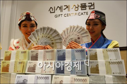 [아시아경제 윤동주 기자] 설을 앞둔 10일 서울 중구 신세계백화점 본점에서 행사 도우미들이 설 상품권 패키지 판매를 알리고 있다.