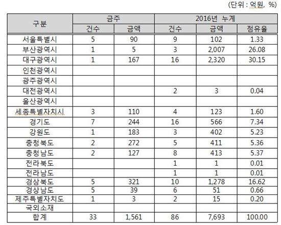 지역별 발주량은 경상북도 321억원, 충청북도 272억원, 대구시 167억원, 경기도 244억원과 이외에 지역 557억원 등으로 구분된다.