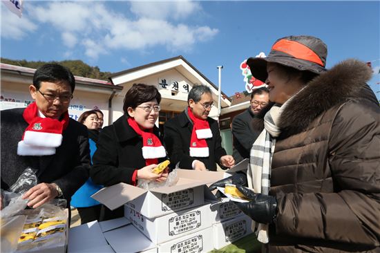 [아시아경제(대전) 정일웅 기자] 코레일은 경북 봉화군 소재 분천역에 조성된 ‘겨울 산타마을’에 올 겨울 누적 관광객 10만여명이 다녀갔다고 26일 밝혔다. 지난해 12월 19일 개장 이래 38일 만이다. 최연혜 사장(왼쪽 두 번째)은 이를 기념하기 위해 26일 분천역을 방문, 관광객들에게 다과와 핫팩 등을 전하며 감사 인사를 전했다. 산타마을은 내달 14일까지 운영된다. 코레일 제공