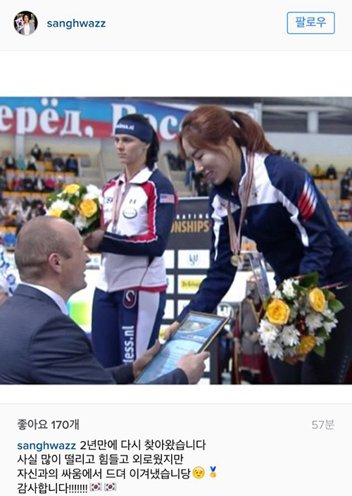 대회 직후 이상화는 자신의 SNS에 “2년 만에 다시 찾아왔습니다”라며 “사실 많이 떨리고 힘들고 외로웠지만 자신과의 싸움에서 드뎌 이겨냈습니당. 감사합니다!!!!!!”고 솔직한 심정을 전했다.