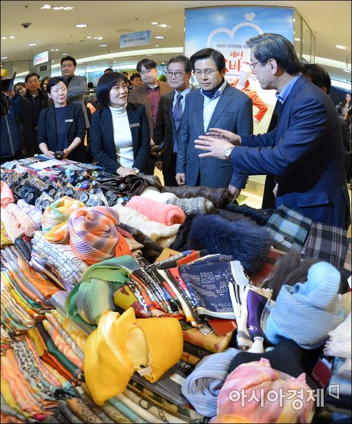 [아시아경제 윤동주 기자] 황교안 국무총리가 21일 서울 중구 롯데백화점에서 열린 '개성공단 입주기업 돕기 패션 바자회'를 찾아 판매원들을 격려후 물건을 구입.
