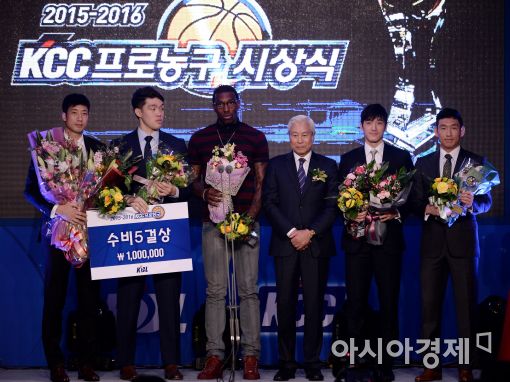 [아시아경제 김현민 기자] 2015~2016 프로농구 시상식이 22일 서울 반포동 JW메리어트 호텔에서 열렸다. KGC 양희종(왼쪽부터), 오리온 이승현, 삼성 라틀리프, KCC 신명호, 모비스 양동근이 수비 5걸상을 수상한 뒤 방열 대한농구협회 회장(오른쪽 세번째)과 기념촬영을 하고 있다.