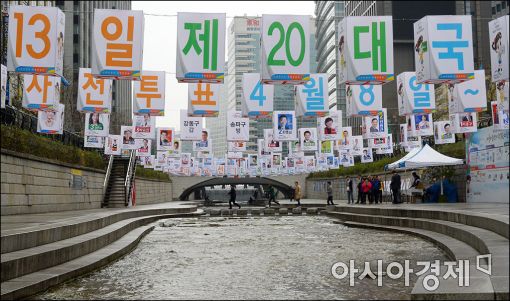 [아시아경제 윤동주 기자] 4. 13총선을 10일 앞둔 3일 서울 청계천 모전교 부근에 설치된 선거독려 구조물을 시민들이 보고 있다.