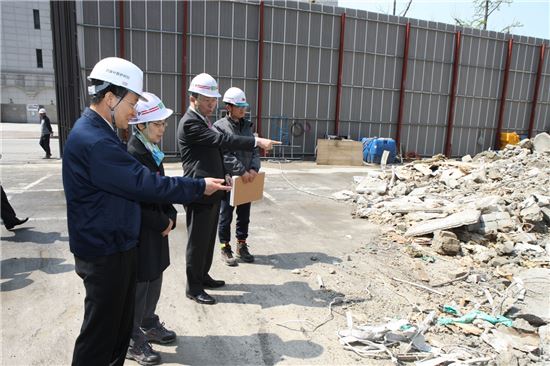 [아시아경제(대전) 정일웅 기자] 정양호 조달청장은 7일 서울 영등포구 소재 ‘광복회관 재건축 건립사업’ 현장을 방문하고 기존 구조물의 철거공사에 따른 민원과 안전관리 조치사항 등을 시찰했다. 건립사업은 지난 1월 조달청 맞춤형서비스를 통해 착공, 오는 2018년 5월 준공을 목표로 공사를 진행 중이다. 총 공사비는 347억원이며 건물규모는 지하 4층·지상 9층에 연면적 1만8431㎡이다. 정 청장(왼쪽에서 세 번째)이 공사 관계자들과 함께 현장을 시찰하고 있다. 조달청 제공