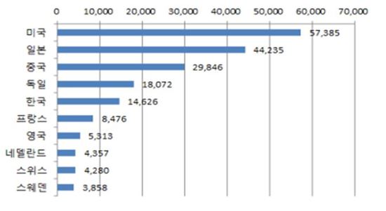 이는 세계지식재산권기구(WIPO)의 발표 자료를 통해 집계된 순위로 당해 국가별 국제출원 추이에서 미국과 유럽 주요국가의 출원건수는 감소(또는 유지)한 반면 우리나라와 아시아권 주요 국가의 출원은 두 자리 수 성장세를 보이는 특징을 나타냈다.