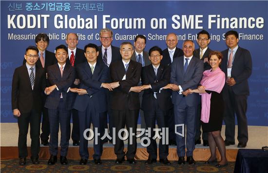 사진 뒷줄 왼쪽부터 시계방향으로 정유신 서강대 교수, 매튜 갬저 중소기업금융포럼 대표, 사이먼 벨 세계은행 글로벌 리드, 쥬세페 그래미냐 미국 중소기업청 수석연구원, 베른하르트 자크마이스터 오스트리아 경제서비스사 대표, 모토히데 하시모토 일본금융공사 이사, 노용환 서울여대 교수, 앤 보슨 프랑스 공공투자은행 부장, 호세 피게레도 포르투갈 국영보증기관 사장, 송재희 중소기업중앙회 상근부회장, 서근우 신용보증기금 이사장, 정은보 금융위원회 부위원장, 앤드류 쉬 율러 허미스 이사, 데니스 쿠아 싱가포르혁신청 부장.