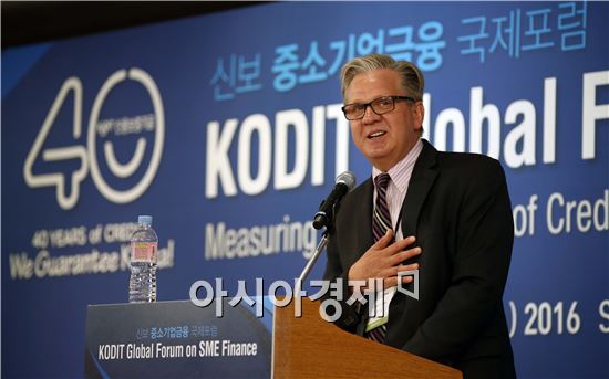 세계은행(World Bank)의 중소기업금융 글로벌 리드 사이먼 벨(Simon C. Bell)이 12일 롯데호텔서울에서 개최된 ‘신보 중소기업금융 국제포럼’에 참석해 기조연설을 하고 있다. 이번 포럼은 신용보증기금이 올해 창립 40주년을 맞이해 처음 개최한 글로벌 포럼으로, 국내외 중소기업금융 전문가 및 관계자 170여 명이 참석한 가운데 성황리에 진행됐다.
